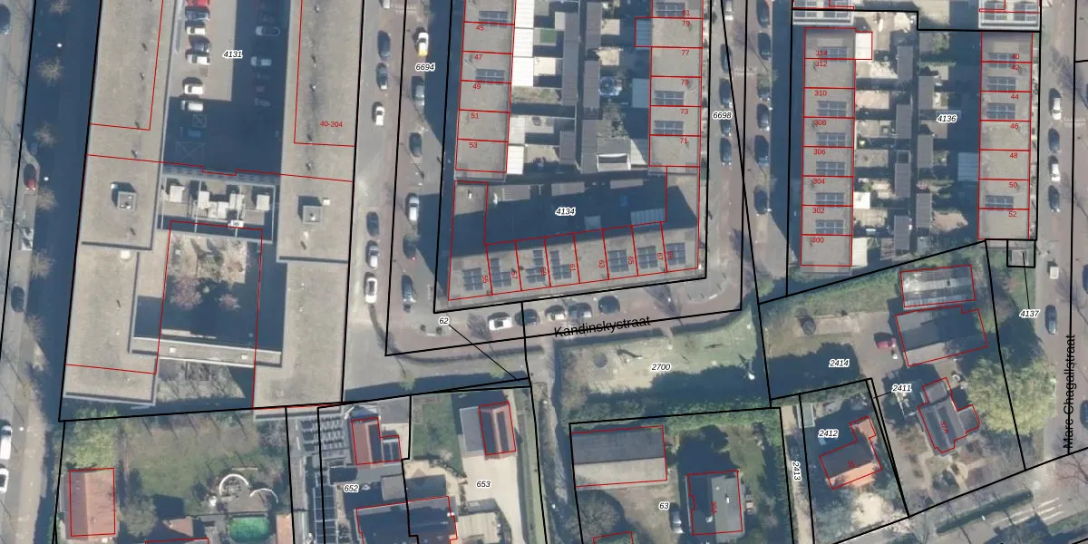 Het perceel waarop Kandinskystraat 59 staat heeft een oppervlakte van 2875 m². Dit is een zeer groot perceel. De perceeloppervlakte wordt geregistreerd door het Kadaster. Gedetailleerde informatie over de maten van dit perceel kunt u vinden in het rapport Kadastrale kaart met maatvoering van Kandinskystraat 59.