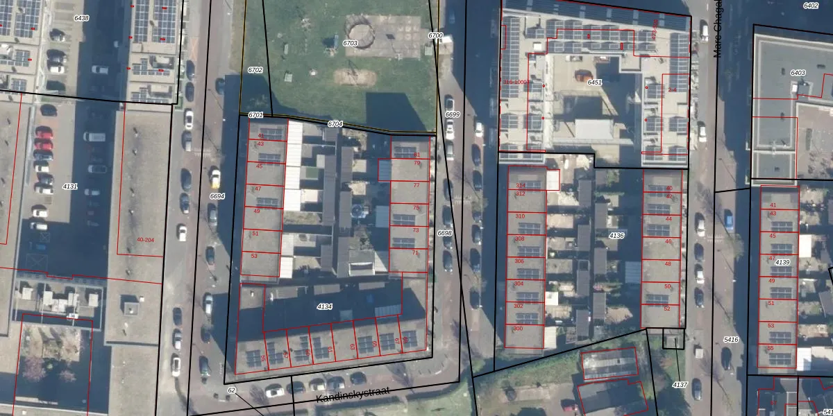 Het perceel waarop Kandinskystraat 75 staat heeft een oppervlakte van 2875 m². Dit is een zeer groot perceel. De perceeloppervlakte wordt geregistreerd door het Kadaster. Gedetailleerde informatie over de maten van dit perceel kunt u vinden in het rapport Kadastrale kaart met maatvoering van Kandinskystraat 75.