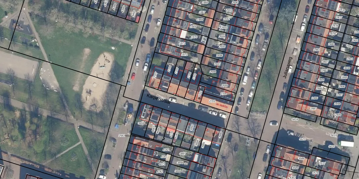 Gebruik de zoekbalk of klik op een perceel voor informatie over de adressen binnen dit perceel.