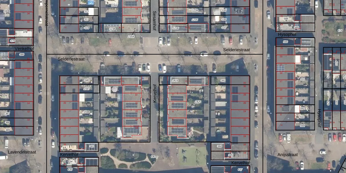 Het perceel waarop Kervelhof 1 staat heeft een oppervlakte van 1810 m². Dit is een zeer groot perceel. De perceeloppervlakte wordt geregistreerd door het Kadaster. Gedetailleerde informatie over de maten van dit perceel kunt u vinden in het rapport Kadastrale kaart met maatvoering van Kervelhof 1.
