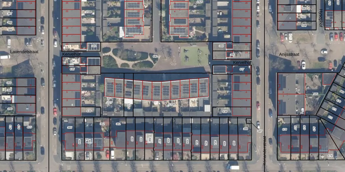 Het perceel waarop Kervelhof 10 staat heeft een oppervlakte van 1602 m². Dit is een zeer groot perceel. De perceeloppervlakte wordt geregistreerd door het Kadaster. Gedetailleerde informatie over de maten van dit perceel kunt u vinden in het rapport Kadastrale kaart met maatvoering van Kervelhof 10.