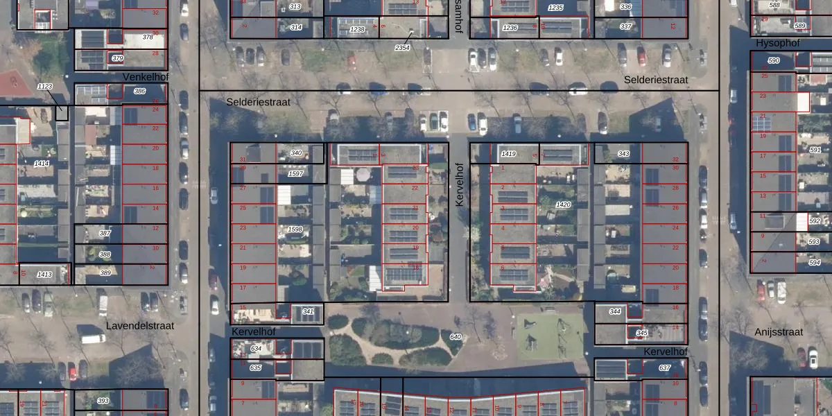 Het perceel waarop Kervelhof 21 staat heeft een oppervlakte van 1785 m². Dit is een zeer groot perceel. De perceeloppervlakte wordt geregistreerd door het Kadaster. Gedetailleerde informatie over de maten van dit perceel kunt u vinden in het rapport Kadastrale kaart met maatvoering van Kervelhof 21.