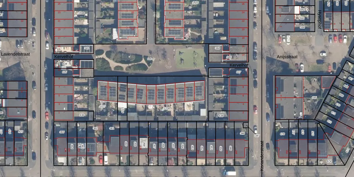 Het perceel waarop Kervelhof 9 staat heeft een oppervlakte van 1602 m². Dit is een zeer groot perceel. De perceeloppervlakte wordt geregistreerd door het Kadaster. Gedetailleerde informatie over de maten van dit perceel kunt u vinden in het rapport Kadastrale kaart met maatvoering van Kervelhof 9.