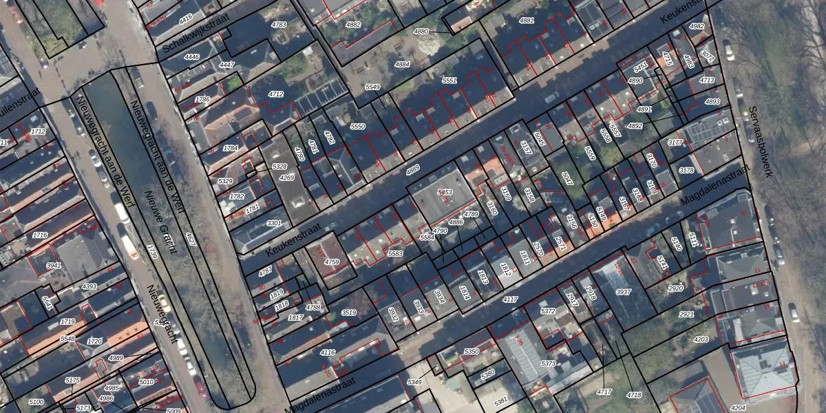 Het perceel waarop Keukenstraat 21 staat heeft een oppervlakte van 81 m². Dit is een klein perceel. De perceeloppervlakte wordt geregistreerd door het Kadaster. Gedetailleerde informatie over de maten van dit perceel kunt u vinden in het rapport Kadastrale kaart met maatvoering van Keukenstraat 21.