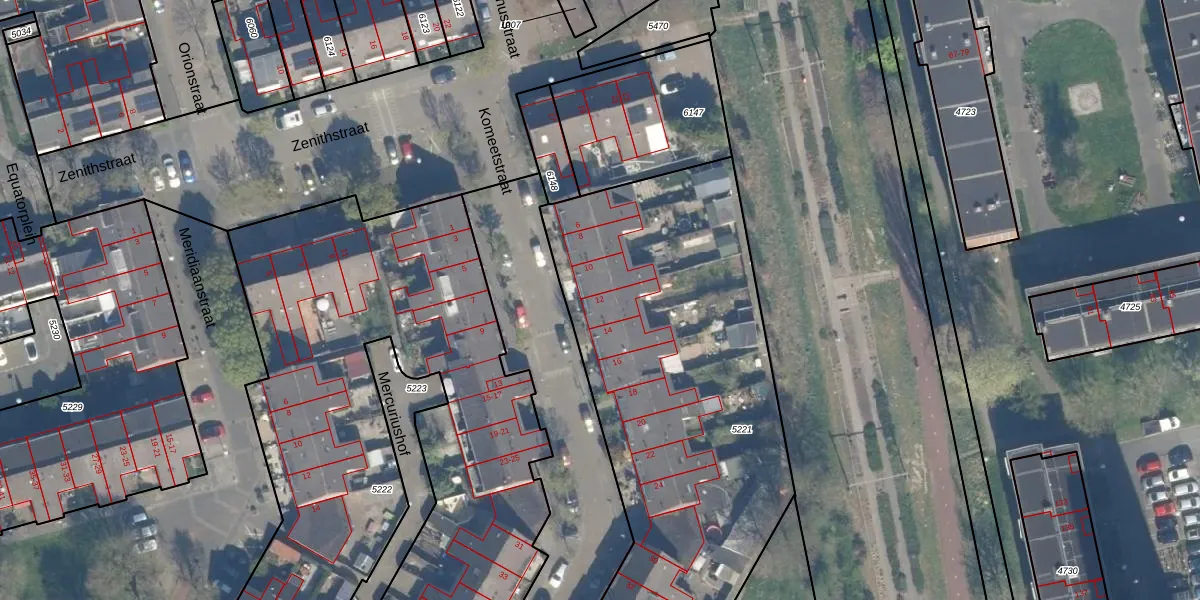 Het perceel waarop Komeetstraat 12 staat heeft een oppervlakte van 3542 m². Dit is een zeer groot perceel. De perceeloppervlakte wordt geregistreerd door het Kadaster. Gedetailleerde informatie over de maten van dit perceel kunt u vinden in het rapport Kadastrale kaart met maatvoering van Komeetstraat 12.