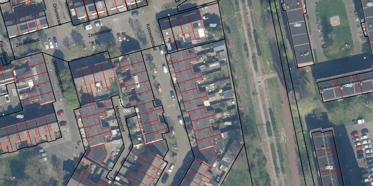 Het perceel waarop Komeetstraat 14 staat heeft een oppervlakte van 3542 m². Dit is een zeer groot perceel. De perceeloppervlakte wordt geregistreerd door het Kadaster. Gedetailleerde informatie over de maten van dit perceel kunt u vinden in het rapport Kadastrale kaart met maatvoering van Komeetstraat 14.