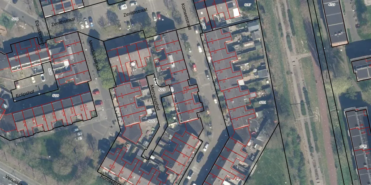Het perceel waarop Komeetstraat 15 staat heeft een oppervlakte van 3508 m². Dit is een zeer groot perceel. De perceeloppervlakte wordt geregistreerd door het Kadaster. Gedetailleerde informatie over de maten van dit perceel kunt u vinden in het rapport Kadastrale kaart met maatvoering van Komeetstraat 15.