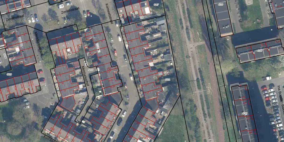 Het perceel waarop Komeetstraat 18 staat heeft een oppervlakte van 3542 m². Dit is een zeer groot perceel. De perceeloppervlakte wordt geregistreerd door het Kadaster. Gedetailleerde informatie over de maten van dit perceel kunt u vinden in het rapport Kadastrale kaart met maatvoering van Komeetstraat 18.