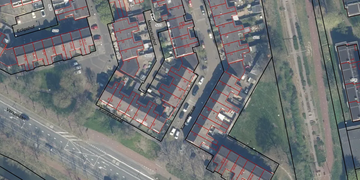Het perceel waarop Komeetstraat 35 staat heeft een oppervlakte van 3508 m². Dit is een zeer groot perceel. De perceeloppervlakte wordt geregistreerd door het Kadaster. Gedetailleerde informatie over de maten van dit perceel kunt u vinden in het rapport Kadastrale kaart met maatvoering van Komeetstraat 35.