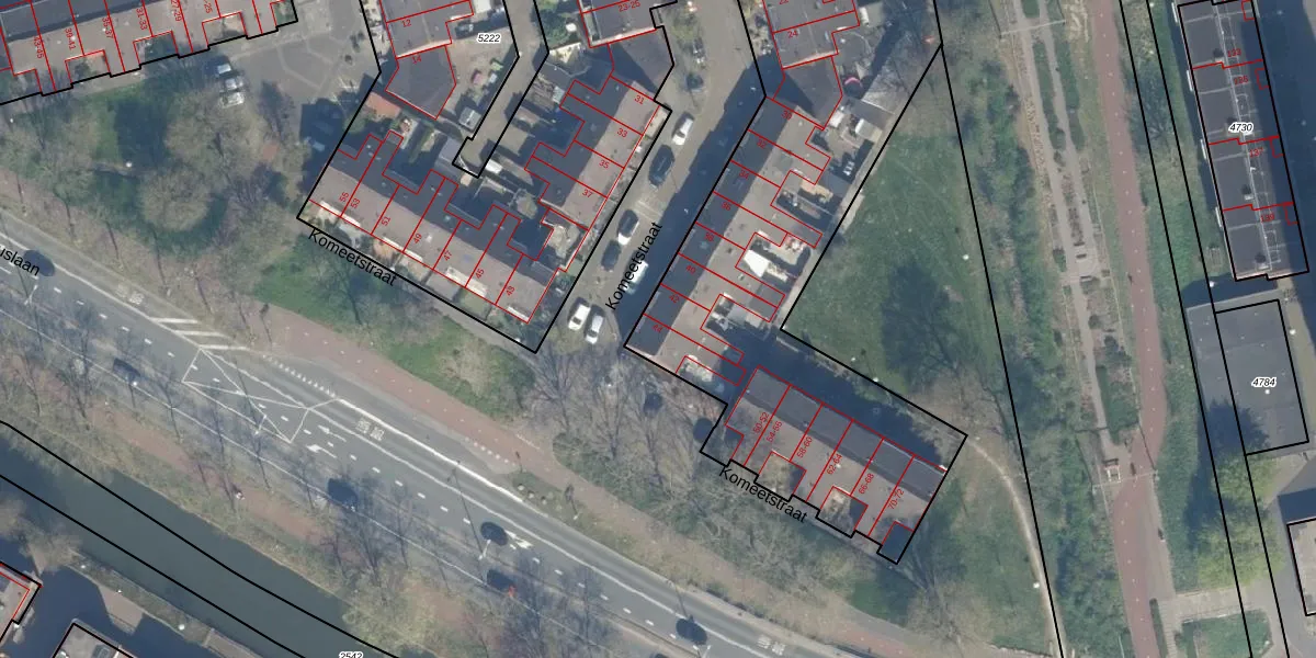 Het perceel waarop Komeetstraat 44 staat heeft een oppervlakte van 3542 m². Dit is een zeer groot perceel. De perceeloppervlakte wordt geregistreerd door het Kadaster. Gedetailleerde informatie over de maten van dit perceel kunt u vinden in het rapport Kadastrale kaart met maatvoering van Komeetstraat 44.