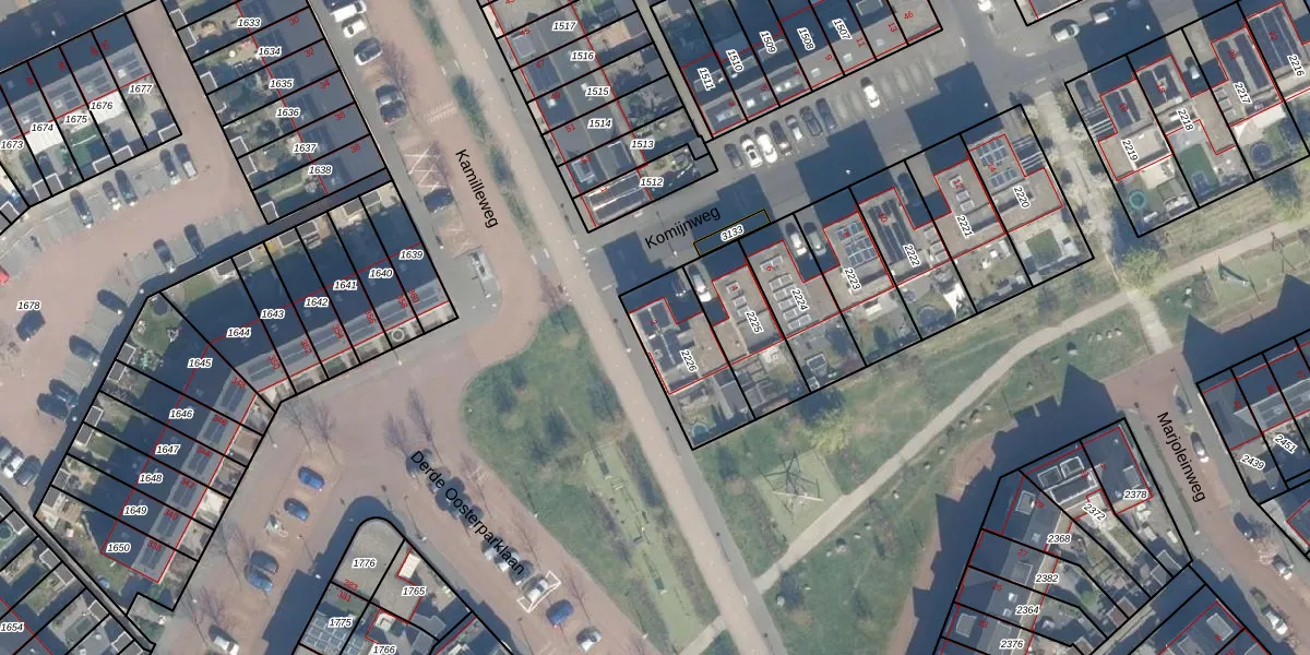 Het perceel waarop Komijnweg 2 staat heeft een oppervlakte van 278 m². Dit is een middelgroot perceel. De perceeloppervlakte wordt geregistreerd door het Kadaster. Gedetailleerde informatie over de maten van dit perceel kunt u vinden in het rapport Kadastrale kaart met maatvoering van Komijnweg 2.