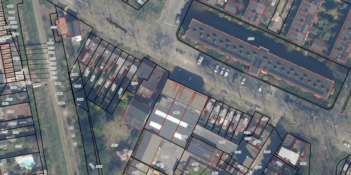 Het perceel waarop Koningsweg 23 staat heeft een oppervlakte van 837 m². Dit is een groot perceel. De perceeloppervlakte wordt geregistreerd door het Kadaster. Gedetailleerde informatie over de maten van dit perceel kunt u vinden in het rapport Kadastrale kaart met maatvoering van Koningsweg 23.