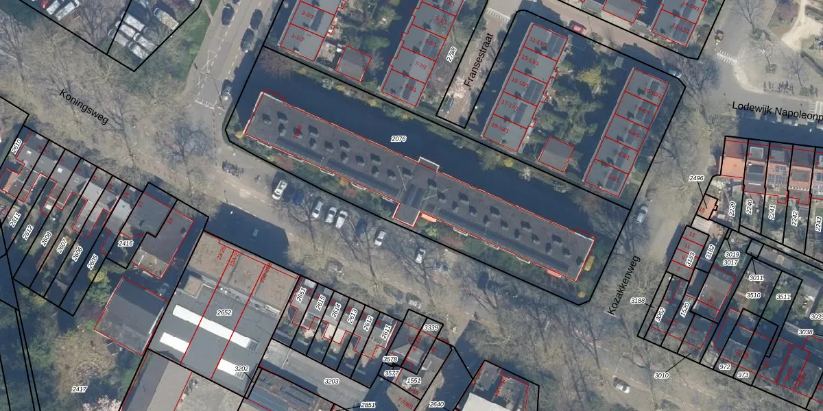 Het perceel waarop Koningsweg 42 staat heeft een oppervlakte van 2508 m². Dit is een zeer groot perceel. De perceeloppervlakte wordt geregistreerd door het Kadaster. Gedetailleerde informatie over de maten van dit perceel kunt u vinden in het rapport Kadastrale kaart met maatvoering van Koningsweg 42.