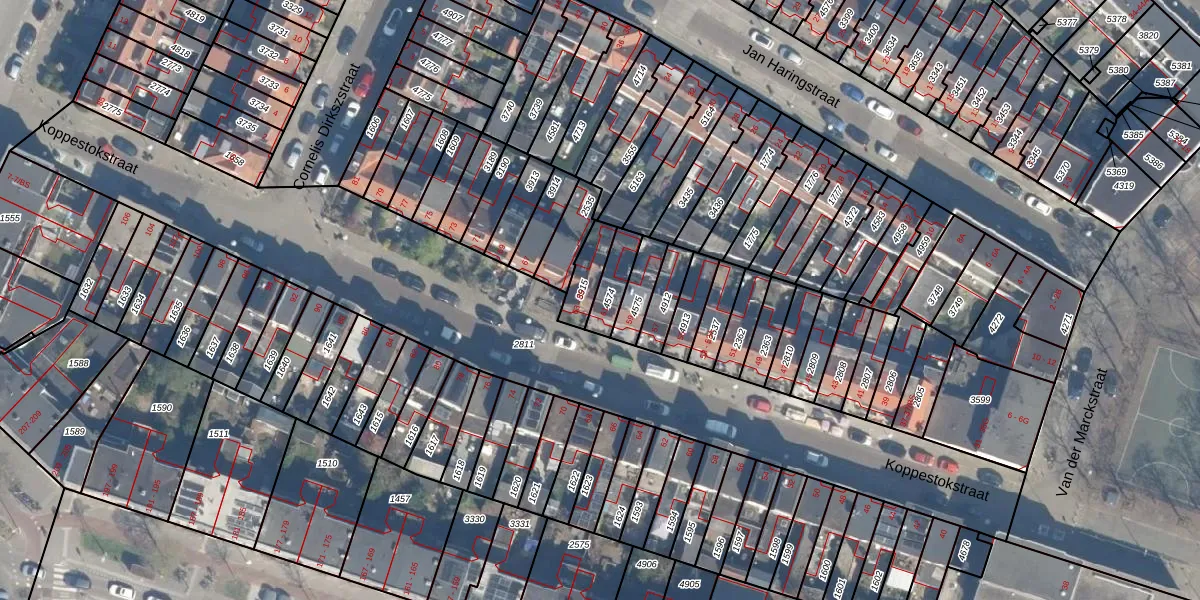 Het perceel waarop Koppestokstraat 61 staat heeft een oppervlakte van 81 m². Dit is een klein perceel. De perceeloppervlakte wordt geregistreerd door het Kadaster. Gedetailleerde informatie over de maten van dit perceel kunt u vinden in het rapport Kadastrale kaart met maatvoering van Koppestokstraat 61.