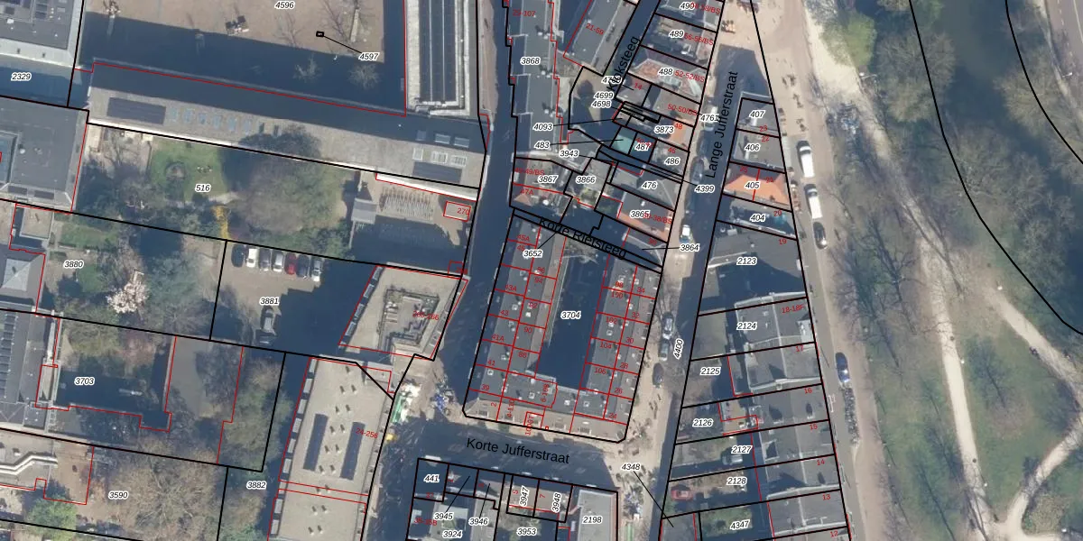 Het perceel waarop Korte Jufferstraat 96 staat heeft een oppervlakte van 1047 m². Dit is een zeer groot perceel. De perceeloppervlakte wordt geregistreerd door het Kadaster. Gedetailleerde informatie over de maten van dit perceel kunt u vinden in het rapport Kadastrale kaart met maatvoering van Korte Jufferstraat 96.