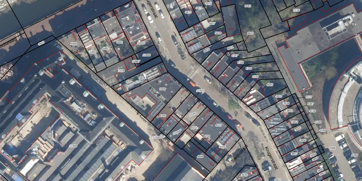 Krugerstraat 5 is gelegen op kadastraal perceel CTR00D8390. Deze kadastrale aanduiding is uniek en wordt gebruikt door het Kadaster om eigendomsrechten en andere zakelijke rechten vast te leggen. Het perceel maakt onderdeel uit van de kadastrale gemeente Catharijne.