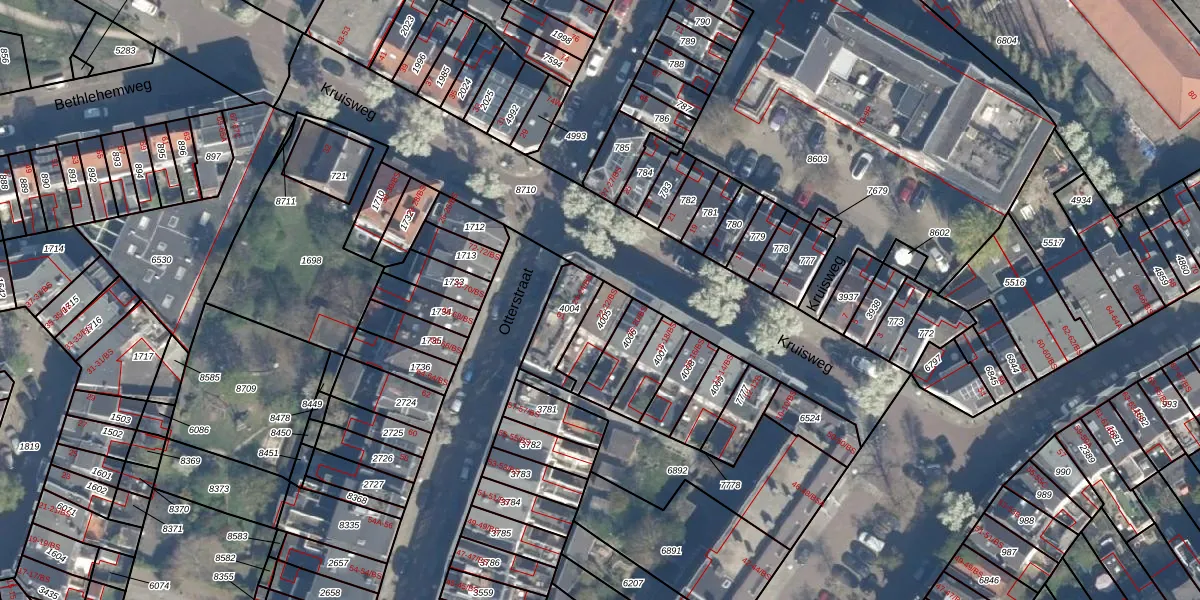 Het perceel waarop Kruisweg 22 staat heeft een oppervlakte van 96 m². Dit is een klein perceel. De perceeloppervlakte wordt geregistreerd door het Kadaster. Gedetailleerde informatie over de maten van dit perceel kunt u vinden in het rapport Kadastrale kaart met maatvoering van Kruisweg 22.