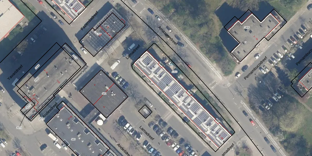 Het perceel waarop Lamadreef 20 staat heeft een oppervlakte van 1555 m². Dit is een zeer groot perceel. De perceeloppervlakte wordt geregistreerd door het Kadaster. Gedetailleerde informatie over de maten van dit perceel kunt u vinden in het rapport Kadastrale kaart met maatvoering van Lamadreef 20.
