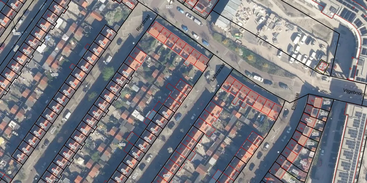 Het perceel waarop Larixstraat 62 staat heeft een oppervlakte van 3545 m². Dit is een zeer groot perceel. De perceeloppervlakte wordt geregistreerd door het Kadaster. Gedetailleerde informatie over de maten van dit perceel kunt u vinden in het rapport Kadastrale kaart met maatvoering van Larixstraat 62.