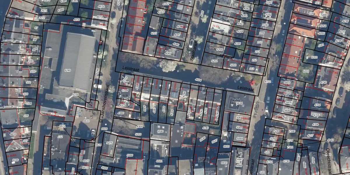 Leistraat 12-BS is gelegen op kadastraal perceel ASD40B4369. Deze kadastrale aanduiding is uniek en wordt gebruikt door het Kadaster om eigendomsrechten en andere zakelijke rechten vast te leggen. Het perceel maakt onderdeel uit van de kadastrale gemeente Abstede.