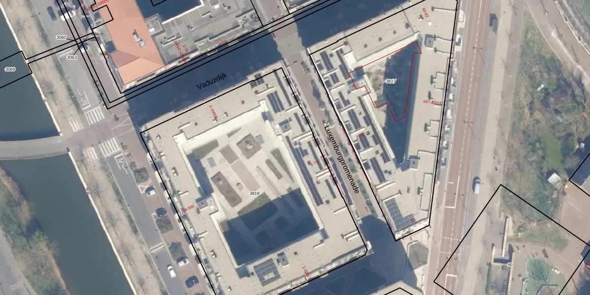 Het perceel waarop Luxemburgpromenade 13 staat heeft een oppervlakte van 3690 m². Dit is een zeer groot perceel. De perceeloppervlakte wordt geregistreerd door het Kadaster. Gedetailleerde informatie over de maten van dit perceel kunt u vinden in het rapport Kadastrale kaart met maatvoering van Luxemburgpromenade 13.