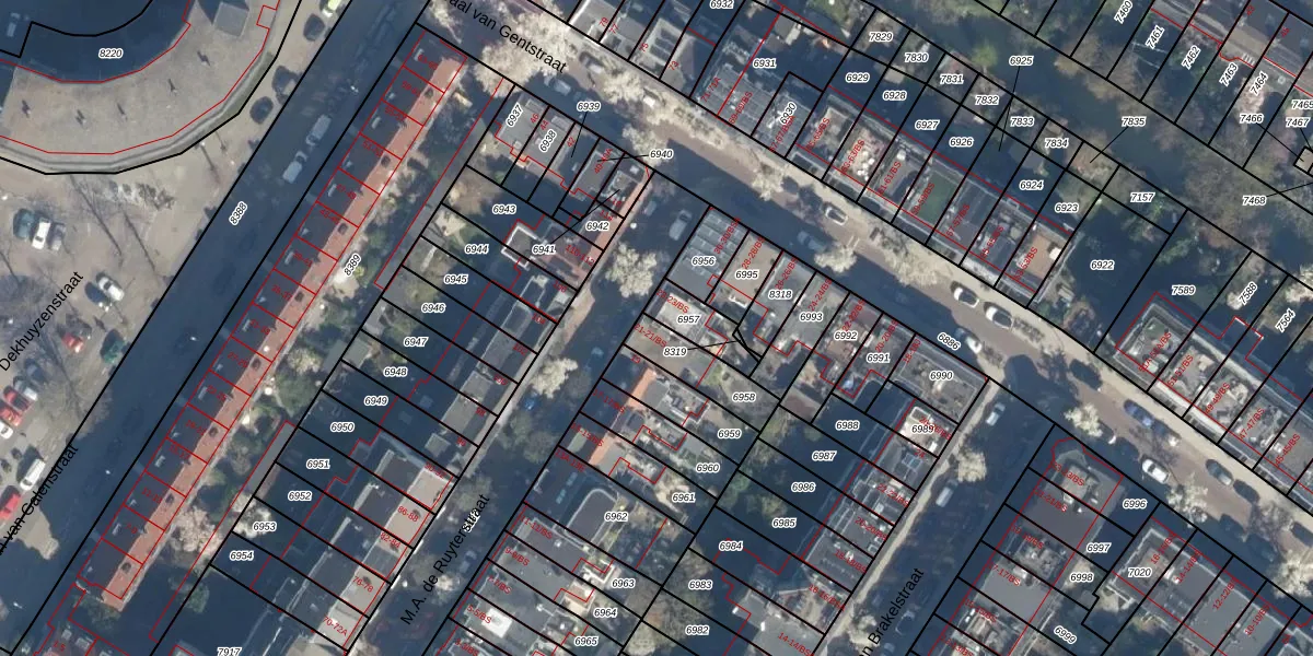 M.A. de Ruyterstraat 21 is gelegen op kadastraal perceel ASD40C6958. Deze kadastrale aanduiding is uniek en wordt gebruikt door het Kadaster om eigendomsrechten en andere zakelijke rechten vast te leggen. Het perceel maakt onderdeel uit van de kadastrale gemeente Abstede.