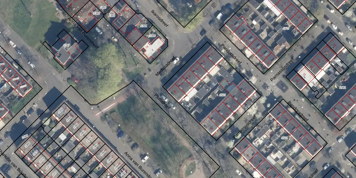 Het perceel waarop Medusadreef 24 staat heeft een oppervlakte van 1537 m². Dit is een zeer groot perceel. De perceeloppervlakte wordt geregistreerd door het Kadaster. Gedetailleerde informatie over de maten van dit perceel kunt u vinden in het rapport Kadastrale kaart met maatvoering van Medusadreef 24.