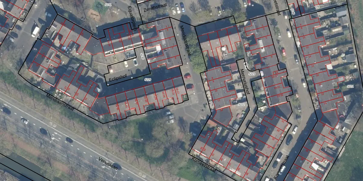 Meridiaanstraat 15 is gelegen op kadastraal perceel ASD40D5229. Deze kadastrale aanduiding is uniek en wordt gebruikt door het Kadaster om eigendomsrechten en andere zakelijke rechten vast te leggen. Het perceel maakt onderdeel uit van de kadastrale gemeente Abstede.