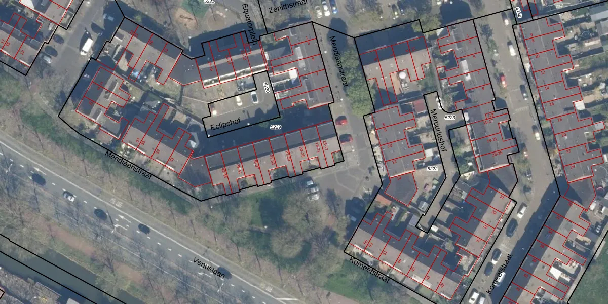Het perceel waarop Meridiaanstraat 23 staat heeft een oppervlakte van 3520 m². Dit is een zeer groot perceel. De perceeloppervlakte wordt geregistreerd door het Kadaster. Gedetailleerde informatie over de maten van dit perceel kunt u vinden in het rapport Kadastrale kaart met maatvoering van Meridiaanstraat 23.