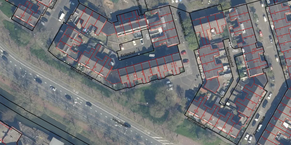 Het perceel waarop Meridiaanstraat 33 staat heeft een oppervlakte van 3520 m². Dit is een zeer groot perceel. De perceeloppervlakte wordt geregistreerd door het Kadaster. Gedetailleerde informatie over de maten van dit perceel kunt u vinden in het rapport Kadastrale kaart met maatvoering van Meridiaanstraat 33.