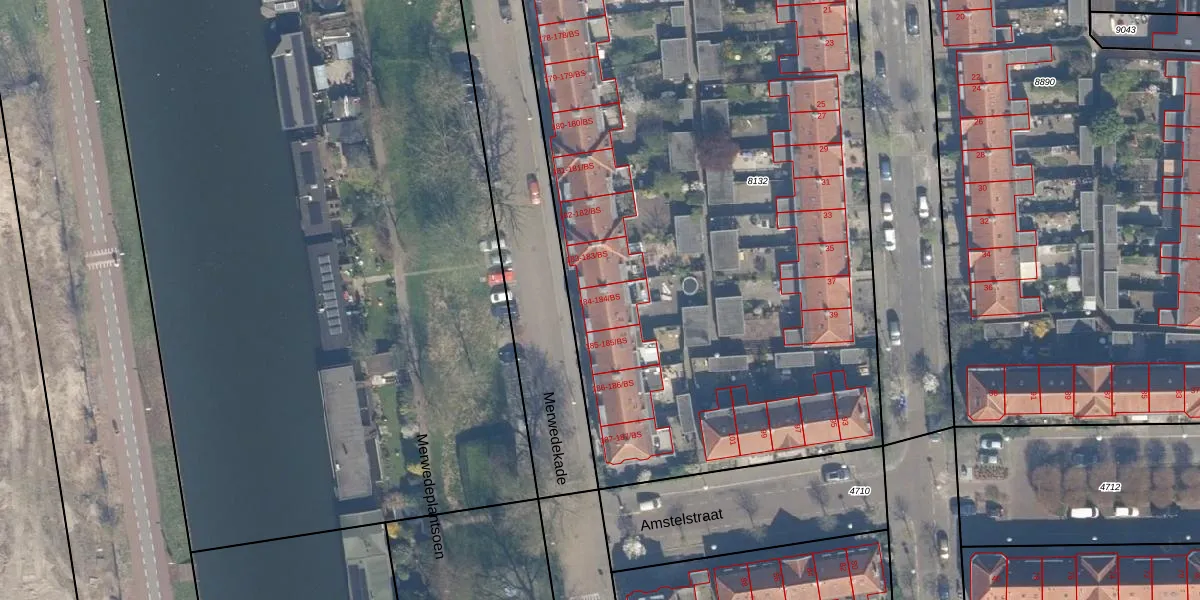 Het perceel waarop Merwedekade 184-BS staat heeft een oppervlakte van 5624 m². Dit is een zeer groot perceel. De perceeloppervlakte wordt geregistreerd door het Kadaster. Gedetailleerde informatie over de maten van dit perceel kunt u vinden in het rapport Kadastrale kaart met maatvoering van Merwedekade 184-BS.