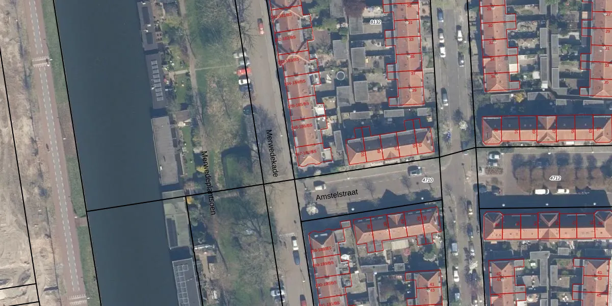 Het perceel waarop Merwedekade 187-BS staat heeft een oppervlakte van 5624 m². Dit is een zeer groot perceel. De perceeloppervlakte wordt geregistreerd door het Kadaster. Gedetailleerde informatie over de maten van dit perceel kunt u vinden in het rapport Kadastrale kaart met maatvoering van Merwedekade 187-BS.
