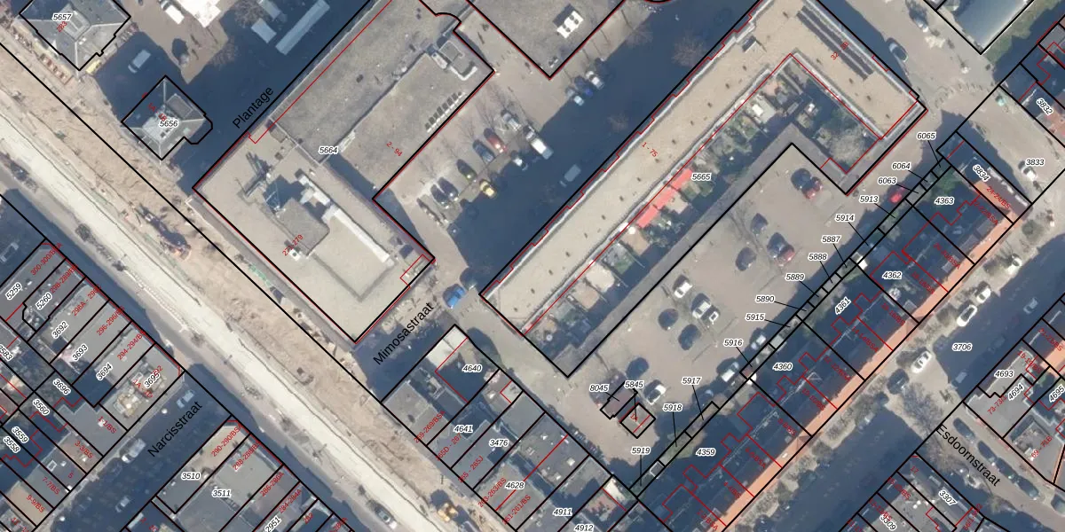 Het perceel waarop Mimosastraat 5 staat heeft een oppervlakte van 2230 m². Dit is een zeer groot perceel. De perceeloppervlakte wordt geregistreerd door het Kadaster. Gedetailleerde informatie over de maten van dit perceel kunt u vinden in het rapport Kadastrale kaart met maatvoering van Mimosastraat 5.