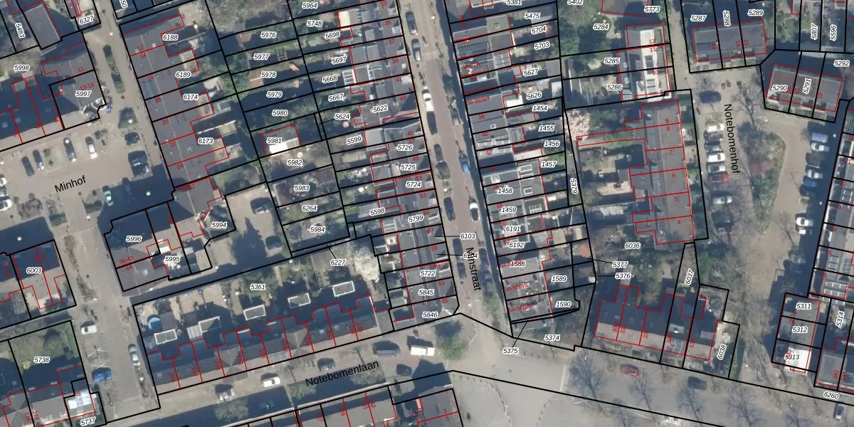 Het perceel waarop Minstraat 55 staat heeft een oppervlakte van 80 m². Dit is een klein perceel. De perceeloppervlakte wordt geregistreerd door het Kadaster. Gedetailleerde informatie over de maten van dit perceel kunt u vinden in het rapport Kadastrale kaart met maatvoering van Minstraat 55.