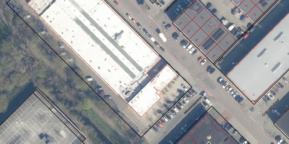 Het perceel waarop Mississippidreef 81-16 staat heeft een oppervlakte van 6558 m². Dit is een zeer groot perceel. De perceeloppervlakte wordt geregistreerd door het Kadaster. Gedetailleerde informatie over de maten van dit perceel kunt u vinden in het rapport Kadastrale kaart met maatvoering van Mississippidreef 81-16.