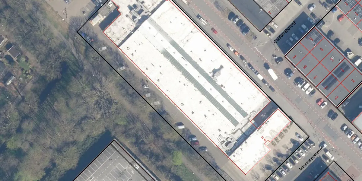 Het perceel waarop Mississippidreef 81-31 staat heeft een oppervlakte van 6558 m². Dit is een zeer groot perceel. De perceeloppervlakte wordt geregistreerd door het Kadaster. Gedetailleerde informatie over de maten van dit perceel kunt u vinden in het rapport Kadastrale kaart met maatvoering van Mississippidreef 81-31.
