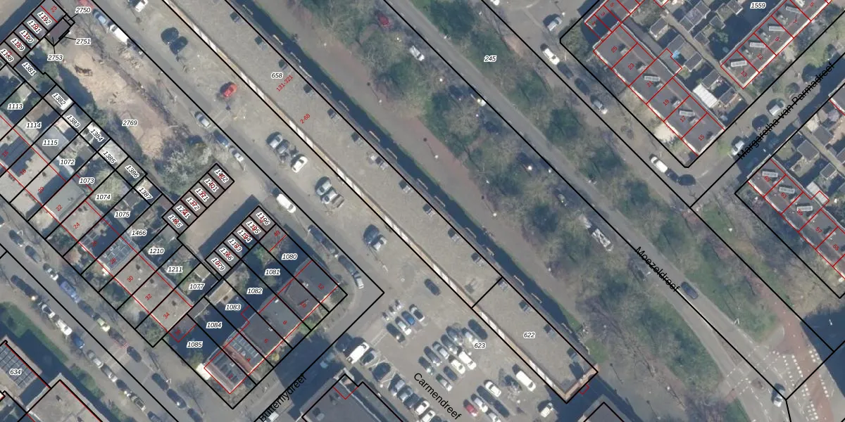 Het perceel waarop Moezeldreef 261 staat heeft een oppervlakte van 1690 m². Dit is een zeer groot perceel. De perceeloppervlakte wordt geregistreerd door het Kadaster. Gedetailleerde informatie over de maten van dit perceel kunt u vinden in het rapport Kadastrale kaart met maatvoering van Moezeldreef 261.