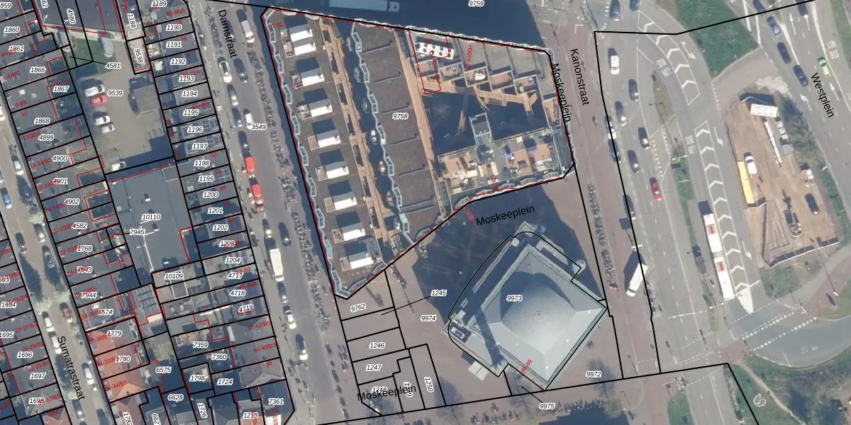 Het perceel waarop Moskeeplein 75 staat heeft een oppervlakte van 3010 m². Dit is een zeer groot perceel. De perceeloppervlakte wordt geregistreerd door het Kadaster. Gedetailleerde informatie over de maten van dit perceel kunt u vinden in het rapport Kadastrale kaart met maatvoering van Moskeeplein 75.