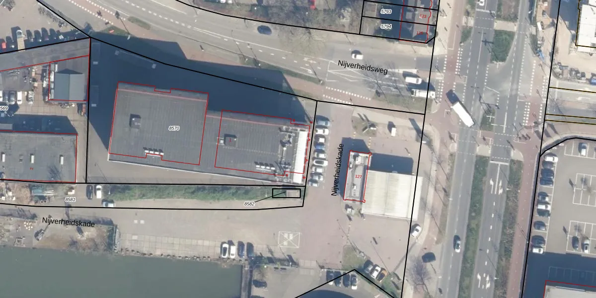 Het perceel waarop Nijverheidskade 1 staat heeft een oppervlakte van 2875 m². Dit is een zeer groot perceel. De perceeloppervlakte wordt geregistreerd door het Kadaster. Gedetailleerde informatie over de maten van dit perceel kunt u vinden in het rapport Kadastrale kaart met maatvoering van Nijverheidskade 1.