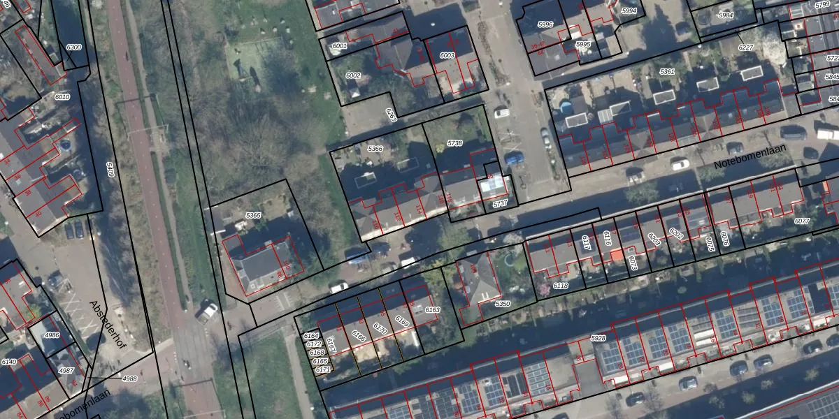 Notebomenlaan 114 is gelegen op kadastraal perceel ASD40D5366. Deze kadastrale aanduiding is uniek en wordt gebruikt door het Kadaster om eigendomsrechten en andere zakelijke rechten vast te leggen. Het perceel maakt onderdeel uit van de kadastrale gemeente Abstede.