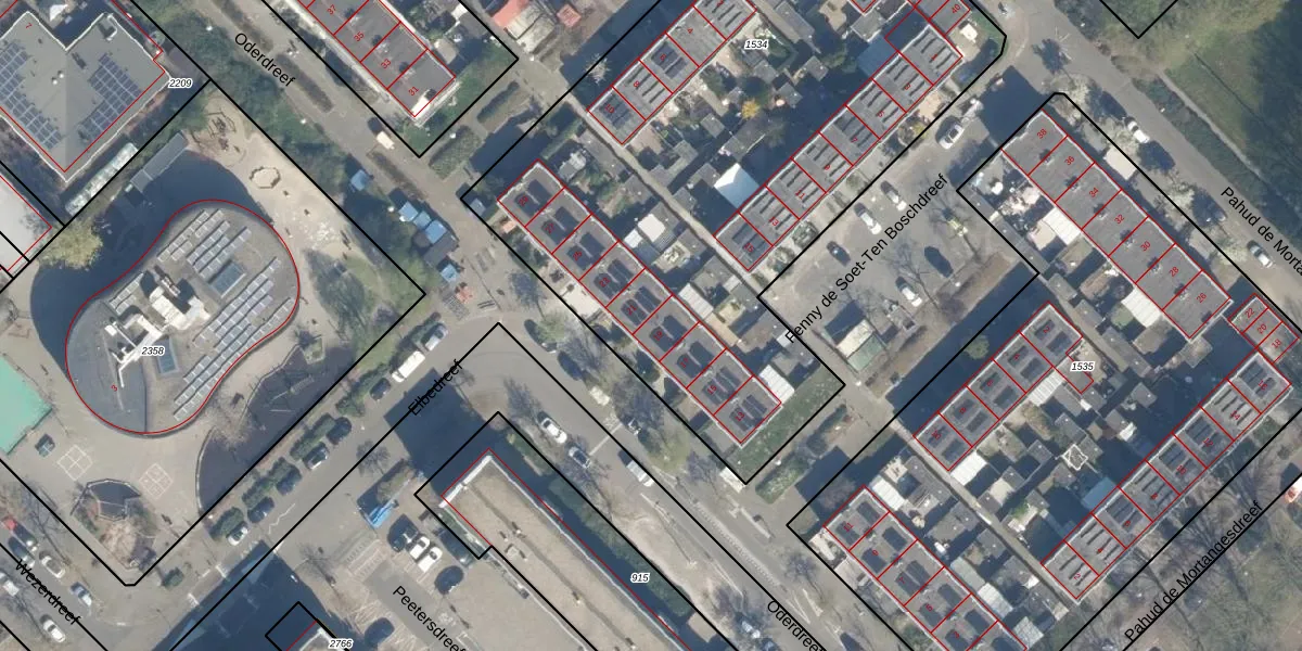 Het perceel waarop Oderdreef 19 staat heeft een oppervlakte van 3997 m². Dit is een zeer groot perceel. De perceeloppervlakte wordt geregistreerd door het Kadaster. Gedetailleerde informatie over de maten van dit perceel kunt u vinden in het rapport Kadastrale kaart met maatvoering van Oderdreef 19.