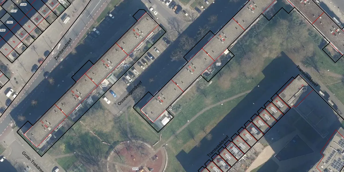 Het perceel waarop Ossewagendreef 76 staat heeft een oppervlakte van 2262 m². Dit is een zeer groot perceel. De perceeloppervlakte wordt geregistreerd door het Kadaster. Gedetailleerde informatie over de maten van dit perceel kunt u vinden in het rapport Kadastrale kaart met maatvoering van Ossewagendreef 76.