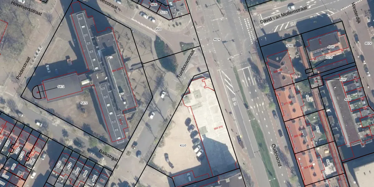 Het perceel waarop Oudenoord 376 staat heeft een oppervlakte van 1717 m². Dit is een zeer groot perceel. De perceeloppervlakte wordt geregistreerd door het Kadaster. Gedetailleerde informatie over de maten van dit perceel kunt u vinden in het rapport Kadastrale kaart met maatvoering van Oudenoord 376.