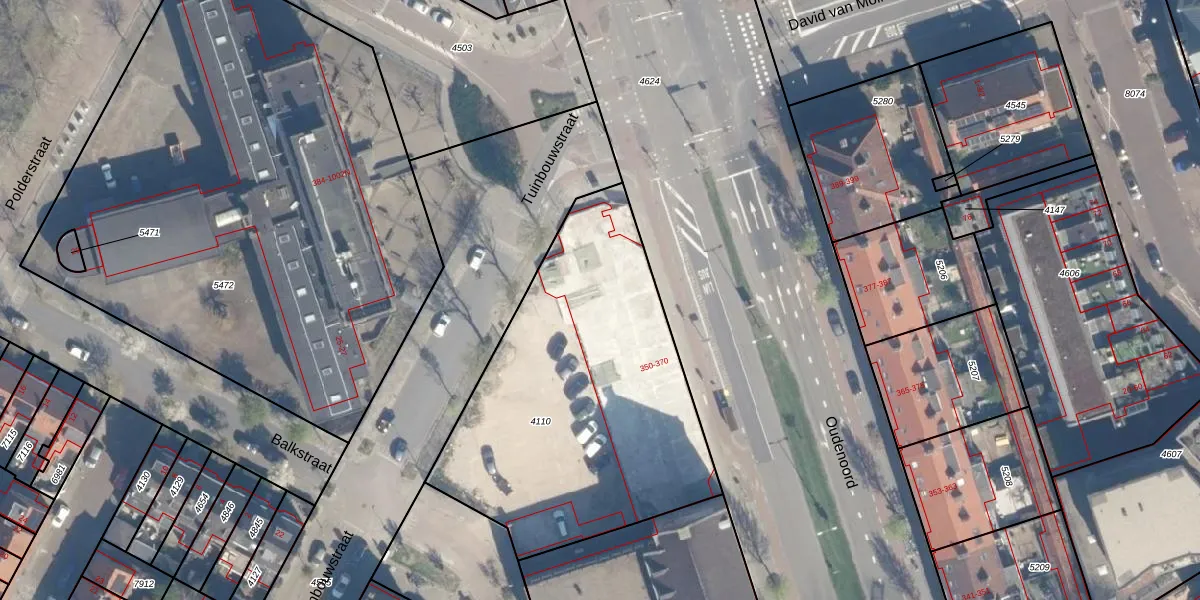 Het perceel waarop Oudenoord 378 staat heeft een oppervlakte van 1717 m². Dit is een zeer groot perceel. De perceeloppervlakte wordt geregistreerd door het Kadaster. Gedetailleerde informatie over de maten van dit perceel kunt u vinden in het rapport Kadastrale kaart met maatvoering van Oudenoord 378.