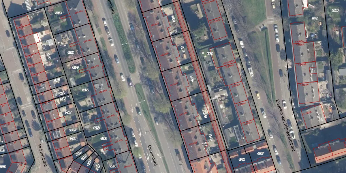 Het perceel waarop Oudenoord 437 staat heeft een oppervlakte van 413 m². Dit is een groot perceel. De perceeloppervlakte wordt geregistreerd door het Kadaster. Gedetailleerde informatie over de maten van dit perceel kunt u vinden in het rapport Kadastrale kaart met maatvoering van Oudenoord 437.