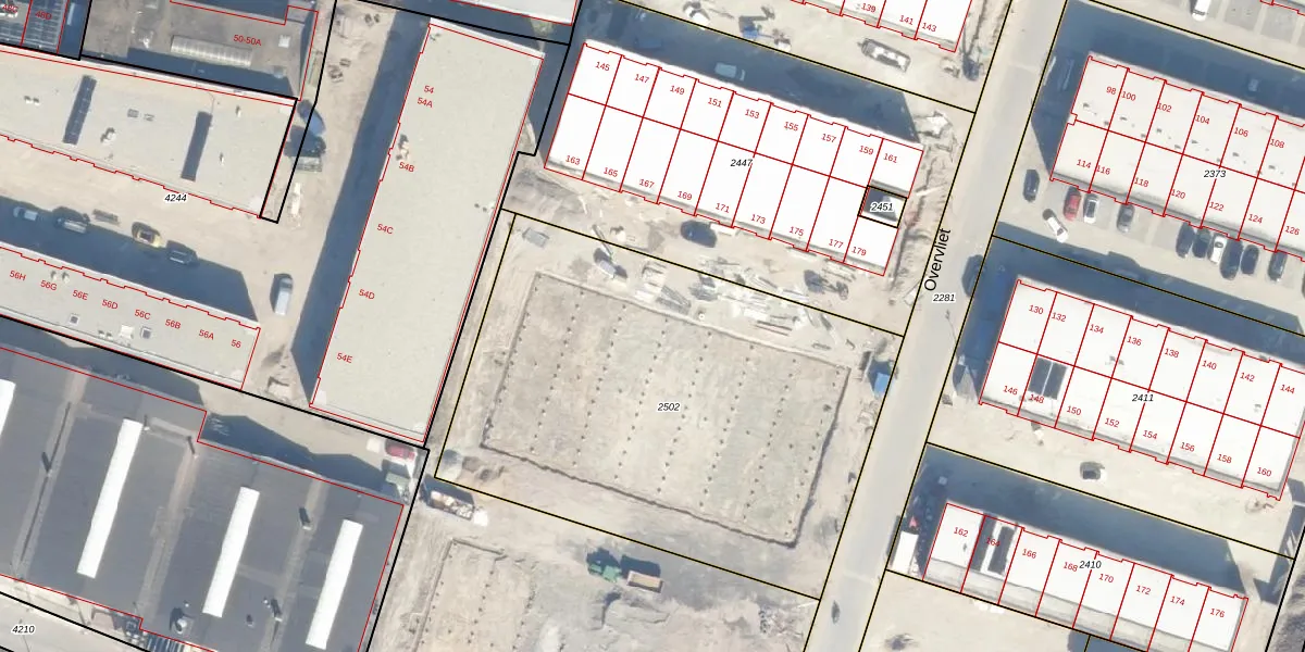 Overvliet 185 is gelegen op kadastraal perceel UTT00T2502. Deze kadastrale aanduiding is uniek en wordt gebruikt door het Kadaster om eigendomsrechten en andere zakelijke rechten vast te leggen. Het perceel maakt onderdeel uit van de kadastrale gemeente Utrecht.