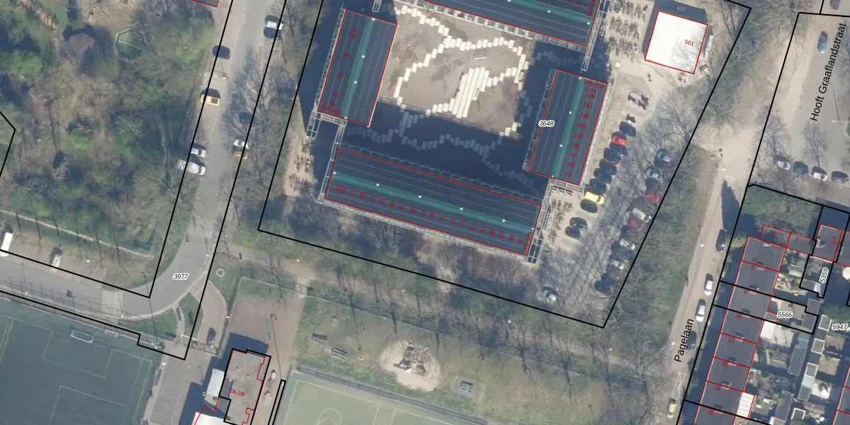 Het perceel waarop Pagelaan 295 staat heeft een oppervlakte van 7766 m². Dit is een zeer groot perceel. De perceeloppervlakte wordt geregistreerd door het Kadaster. Gedetailleerde informatie over de maten van dit perceel kunt u vinden in het rapport Kadastrale kaart met maatvoering van Pagelaan 295.