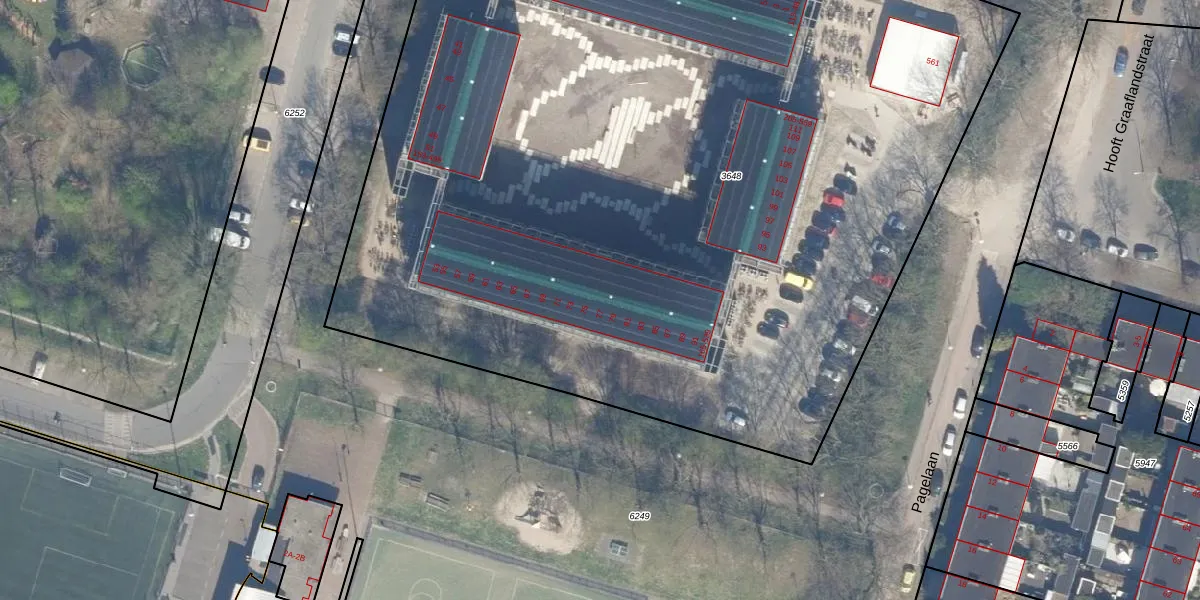 Het perceel waarop Pagelaan 523 staat heeft een oppervlakte van 7766 m². Dit is een zeer groot perceel. De perceeloppervlakte wordt geregistreerd door het Kadaster. Gedetailleerde informatie over de maten van dit perceel kunt u vinden in het rapport Kadastrale kaart met maatvoering van Pagelaan 523.