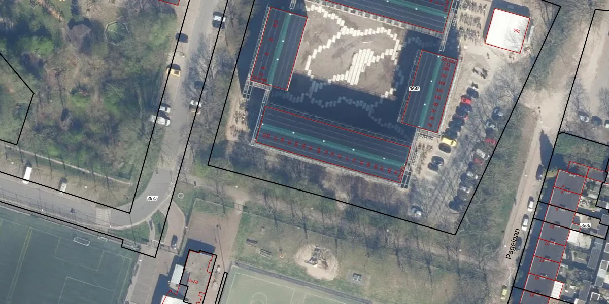Het perceel waarop Pagelaan 65 staat heeft een oppervlakte van 7766 m². Dit is een zeer groot perceel. De perceeloppervlakte wordt geregistreerd door het Kadaster. Gedetailleerde informatie over de maten van dit perceel kunt u vinden in het rapport Kadastrale kaart met maatvoering van Pagelaan 65.