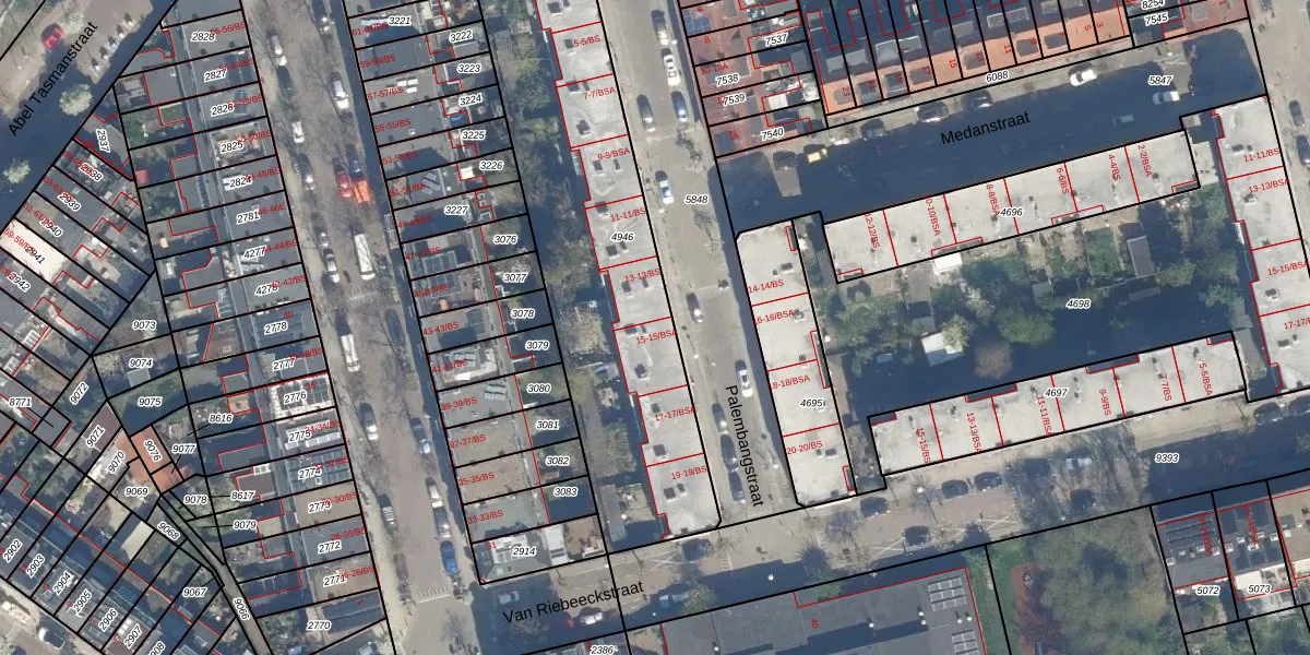 Het perceel waarop Palembangstraat 15 staat heeft een oppervlakte van 1696 m². Dit is een zeer groot perceel. De perceeloppervlakte wordt geregistreerd door het Kadaster. Gedetailleerde informatie over de maten van dit perceel kunt u vinden in het rapport Kadastrale kaart met maatvoering van Palembangstraat 15.